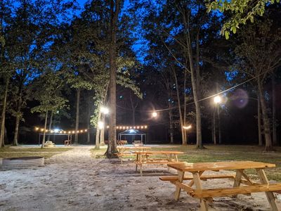 We have upgraded our private party areas! Both of our private party fire pits have brand-new fire rings and a 12'x16' pavilion with upgraded electric. Each party area has a 10' long food service table with 8 electrical outlets built right into it! We now have the power to let each fire pit plug in up to 8 crock pots! Please, if you will need more than 8 crock pots, please consider bringing Sterno or other non-electric heating methods. Each fire pit will have four, 8' long picnic tables and one 6' long picnic table and two 8-foot benches. You may bring decorations, but the pavilions are metal so please bring tape if you are going to hang any banners.
